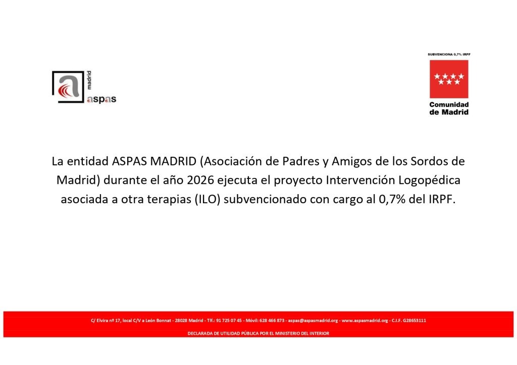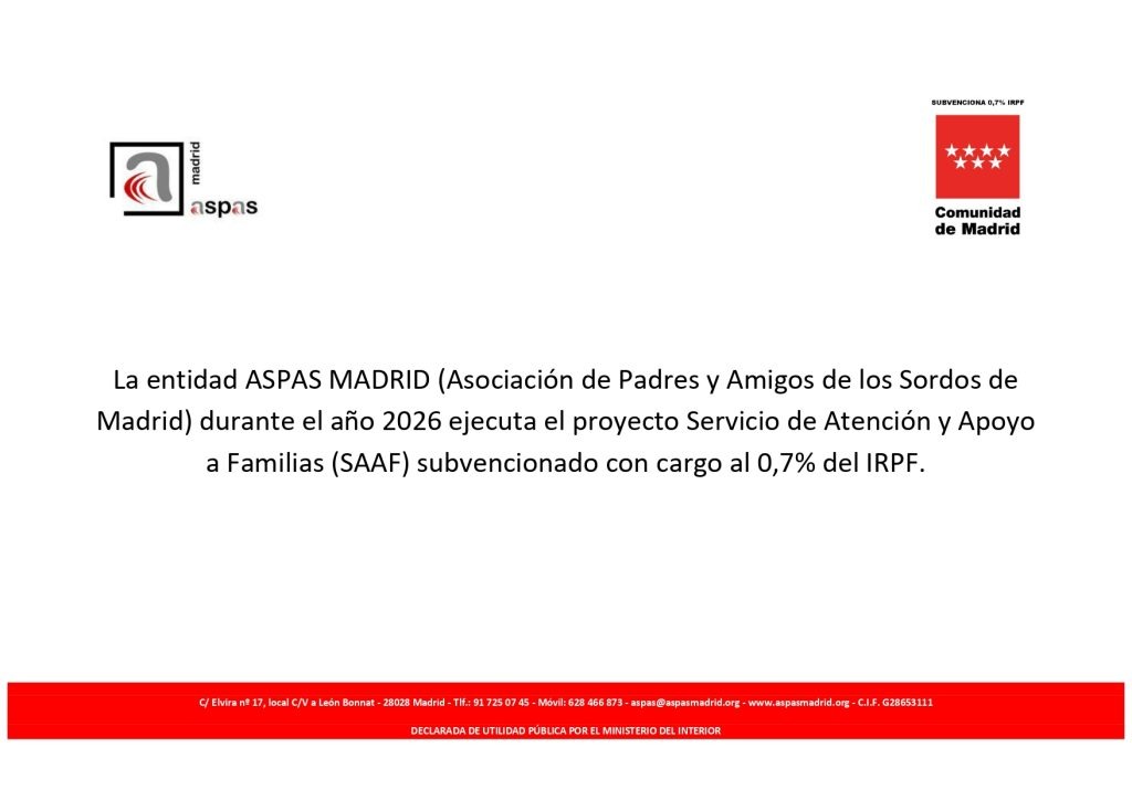(ASPAS Madrid), es una entidad sin ánimo de lucro, Declarada de Utilidad Pública por el Ministerio del Interior. ASPAS Madrid lleva desde el año 1972 trabajando por y para la inclusión de las personas con discapacidad auditiva y apoyando a sus familias